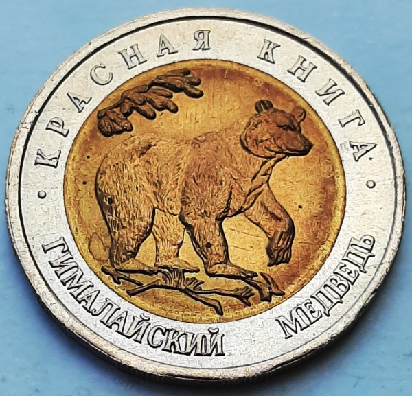• União Soviética 1993 10 Rublos Moeda Comemorativa: Série Livro Vermelho Urso do Himalaia Bimetálica: centro de Alumínio-Bronze, anel de Cupro-Níquel Y# 330