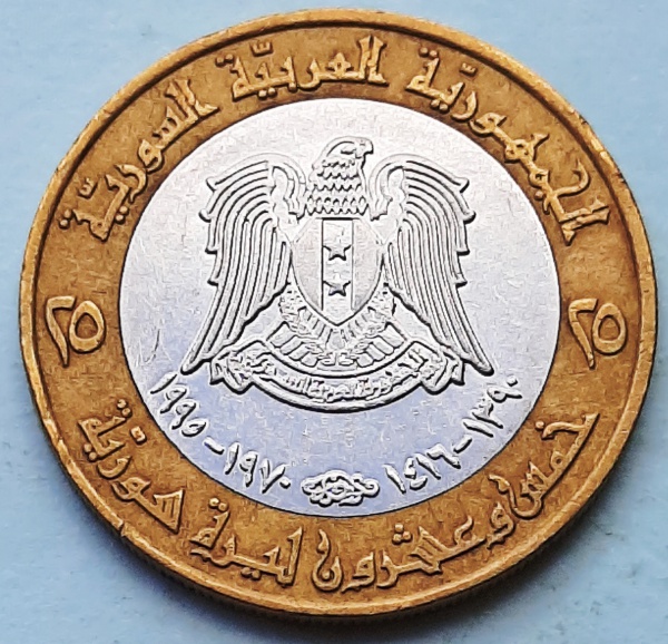• Síria 1995 25 Libras 25º Aniversário - Movimento Corretivo Bimetálica: centro de Aço inoxidável, anel de Alumínio-Bronze KM# 122
