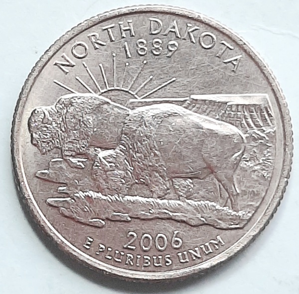• Estados Unidos 2006 `Dakota do Norte` Moeda Comemorativa da Série State Quarters Cunhagem `P` Filadélfia KM# 385