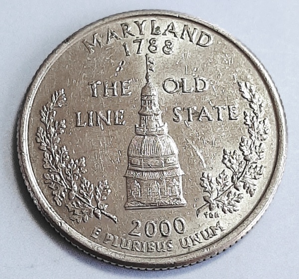 • Estados Unidos 2000 `Maryland` Moeda Comemorativa da Série State Quarters Cunhagem `D` Denver KM# 306